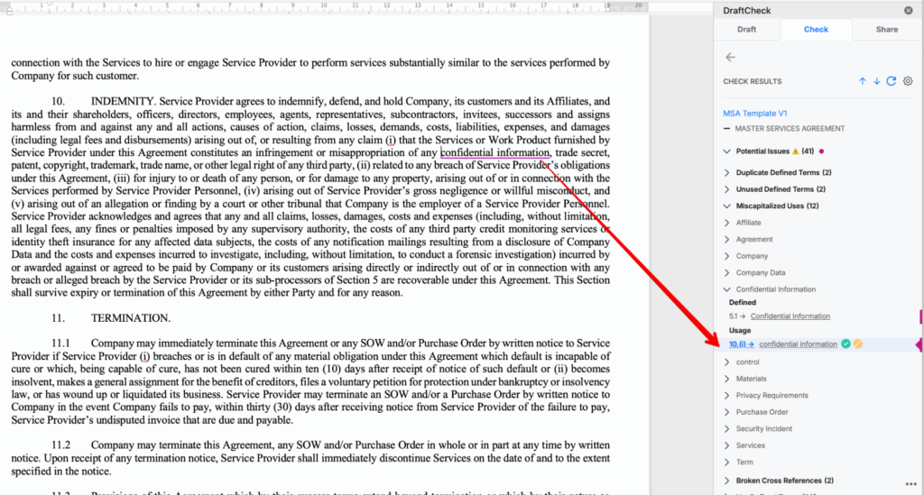 This feature automatically finds places in your document where a Defined Term is used with the wrong capitalization compared to how it was originally defined.